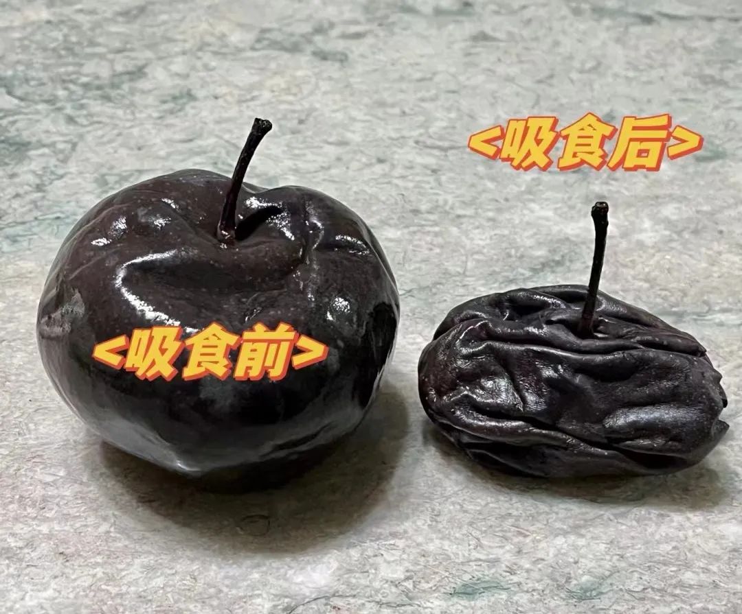 在 “缓”的过程中,由于冻梨的冰点低于 0 ℃,在果皮外会形成一层薄冰。如果你喜欢吃冰沙口感的,可以在冻梨表面摸起来有一点软的时候,直接扒皮开吃。如果你喜欢喝梨汁,就可以等冻梨摸起来特别软之后再将它拿起来。拔掉梨把儿之后冻梨上方会露出一个小孔,接下来,你只需要对准这个小孔疯狂吸溜就行。