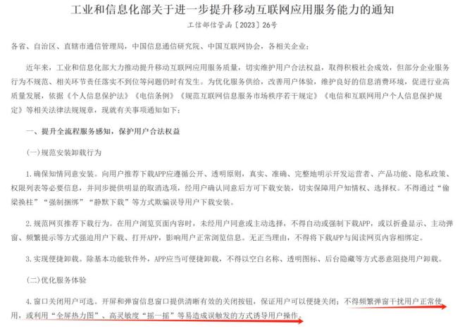 2023年2月,工信部发布《关于进一步提升移动互联网应用服务能力的通知》,要求优化服务体验,“不得频繁弹窗干扰用户正常使用,或利用‘全屏热力图’、高灵敏度‘摇一摇’等易造成误触发的方式诱导用户操作。”