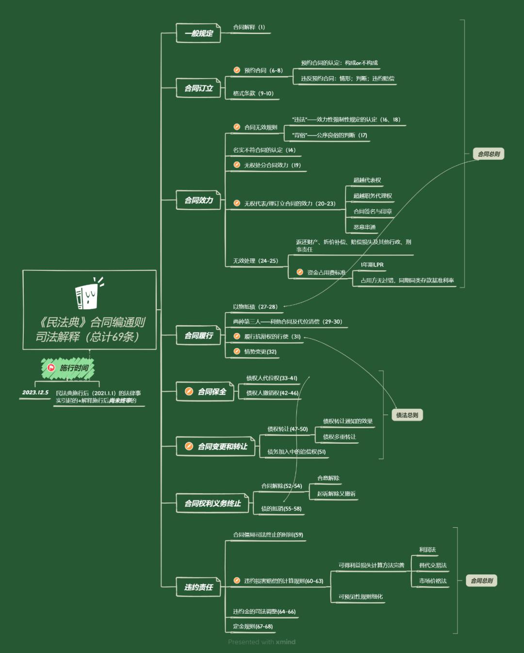 新公布施行的合同编通则司法解释涉及总计69个条文,该司法解释实际涵盖了合同总则与债法总则两大版块内容,故增订与细化的内容相对较多。根据合同编通则司法解释的具体条文、最高人民法院答记者问意见以及参与编写司法解释的专家学者意见,本文整理汇总形成了以下的大纲思维导图。思维导图列明了合同编通则司法解释增订细化的主要内容及对应的具体条文,可供了解本次司法解释的总体框架。
