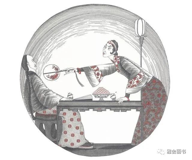 “世舫回过头去,只见门口背着光立着一个小身材的老太太,脸看不清楚,穿一件青灰团龙宫织缎袍,双手捧着大红热水袋,身旁夹峙着两个高大的女仆。”