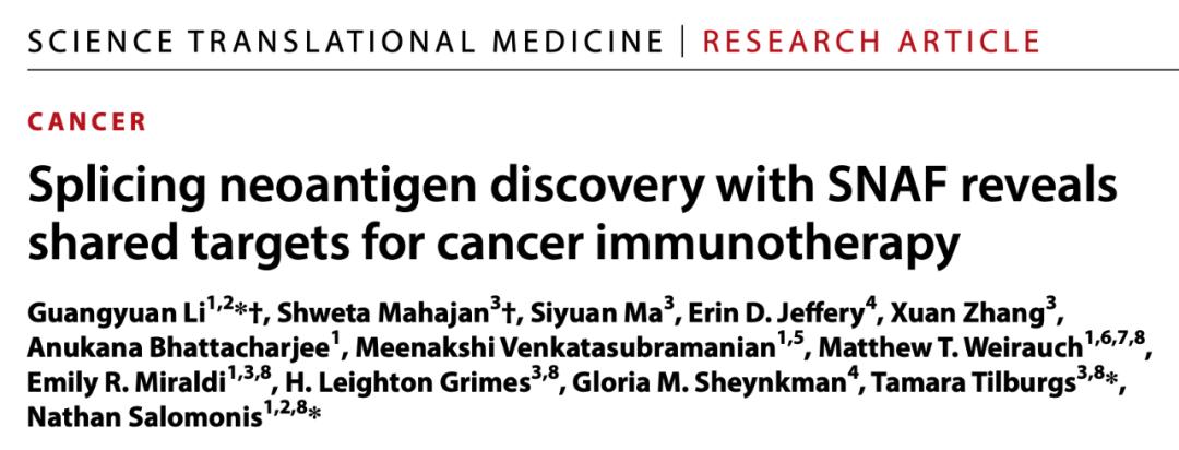 2024年1月17日,辛辛那提儿童医院医学中心Nathan Salomonis教授、李光远博士等在 Science 子刊 Science Translational Medicine 上发表了题为:Splicing neoantigen discovery with SNAF reveals shared targets for cancer immunotherapy 的研究论文。