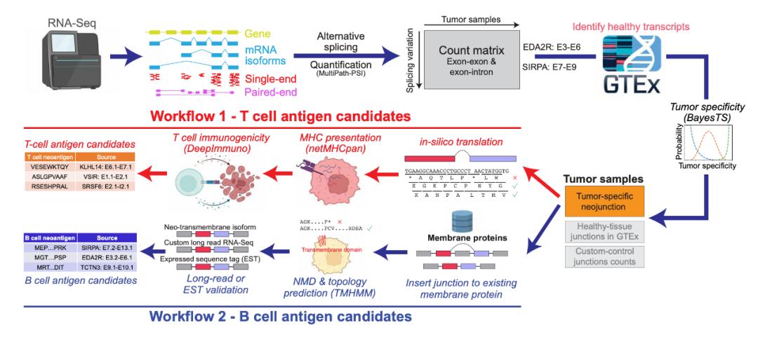 尽管新抗原通常由肿瘤相关基因突变产生,但也可能由不同的转录后调控机制产生。为了全面定义来自患者的RNA测序数据的肿瘤特异性和可能具有免疫原性的新抗原,研究团队开发了名为剪接新抗原发现器(SNAF)的计算工具,这是一个易于使用和开源的计算工作流,,旨在通过识别转录后修饰(尤其是剪接错误)产生的新抗原来扩展免疫治疗范围。该工作流融合了先进的深度学习模型(DeepImmuno)和概率算法模型(BayesTS),前者对新抗原的免疫原性进行预测,后者对新抗原的肿瘤特异性进行排名,从而识别、优先排序和解释不同的剪接新抗原类别,创建了SNAF-T工作流(预测T细胞抗原)和SNAF-B工作流(预测B细胞抗原)。