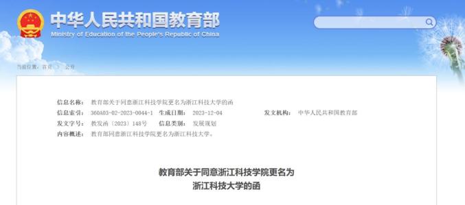 此前,教育部印发关于同意浙江科技学院更名为浙江科技大学、嘉兴学院更名为嘉兴大学的函。