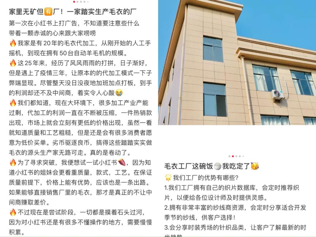 源头工厂走向台前事实上,不少“90后”“00后”的“厂二代”也在主动让源头工厂在台前“卷”起来。锌刻度留意到,在小红书等社交平台上,不少“厂二代”注册账号通过多途径带货,覆盖的产品品类从服饰到首饰再到家具和日常生活用品,不乏类似于“家里的毛衣工厂,不让中间商赚差价”“救救31年的心血,像儿子的羊毛衫工厂”的帖子。