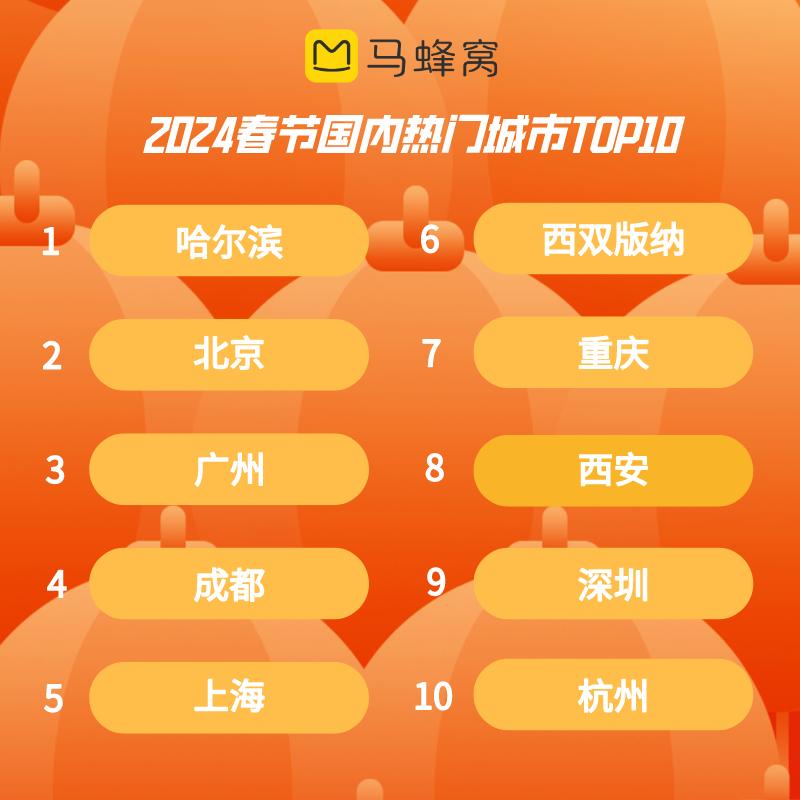 马蜂窝大数据显示,近一周,“春节去哪玩”热度上涨350%,并呈不断上升趋势。团圆佳节让阖家出游成为大多数游客的选择,家庭亲子客群在春节出行人群中占比高达42%。以花灯、庙会、集市为代表的传统年俗项目成为国内春节出行的主旋律。哈尔滨延续元旦期间热度,年味儿十足的潮汕地区也进入游客行程单,“潮汕过春节”近一周热度环比涨幅超过157%。