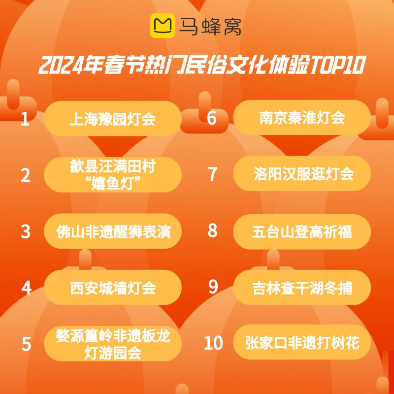 特色民俗体验、非遗文化表演、庙会灯会、新年祈福等传统年俗活动,近年来尝试与潮流文化结合,对年轻人的吸引力与日俱增。上海豫园灯会上的“一夜鱼龙舞”将东方美学演绎到极致,一跃成为本地和外地游客的必打卡景点,热度上涨113%。