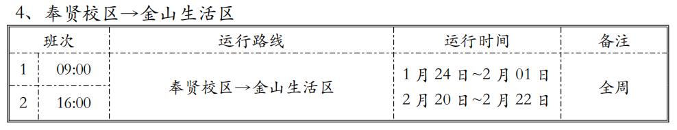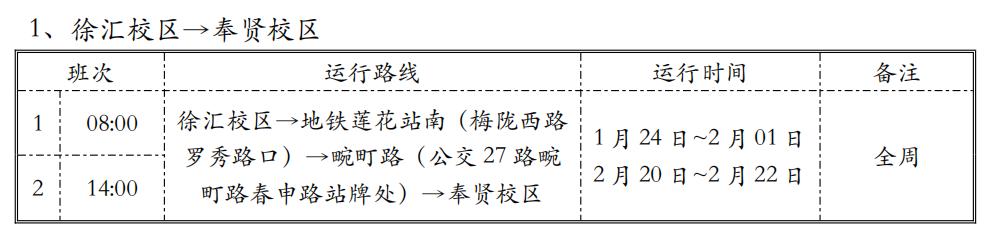 【温馨提示】1. 寒假期间,留校学生可乘坐教职工班车,上车刷校园卡扣费;奉贤校区学生在北正门站排队候车,徐汇校区学生在南大门站排队候车。