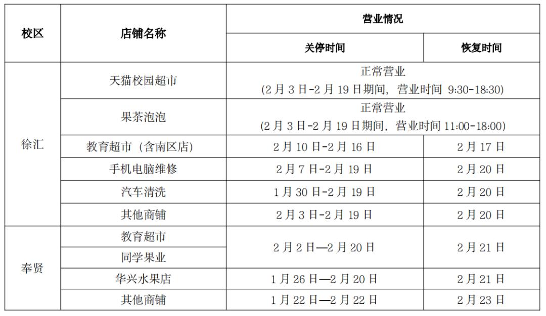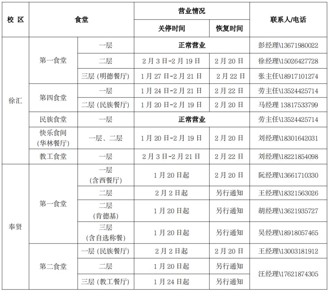 1. 徐汇校区超纯水供应:1月26日—2月19日期间暂停供应,2月20日起恢复正常。2. 奉贤校区锅炉房:2月2日—2月19日期间暂停服务,2月20日起恢复正常。