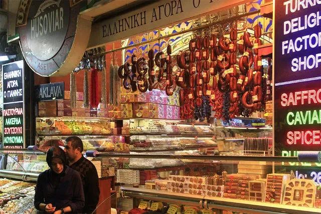 如迷宫一般的大巴扎,充满各种店面,金银首饰、皮毛、地毯、琉璃灯、瓷花瓶、画碗……每一样都令人爱不释手。烤肠一串串挂在店铺前,各种香料的味道扑面而来,令人垂涎欲滴。大巴扎总是充满了各种夸张的色彩和迷人的香气。