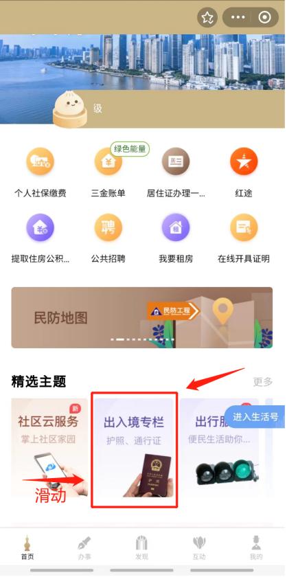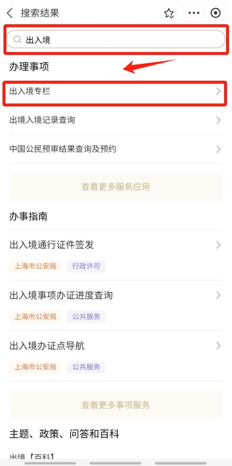 打开、“随申办”APP、“随申办”支付宝小程序,首页下滑,在“精选主题”栏目中找到,或在搜索栏搜索关键词“出入境”,即可快速找到对应服务。