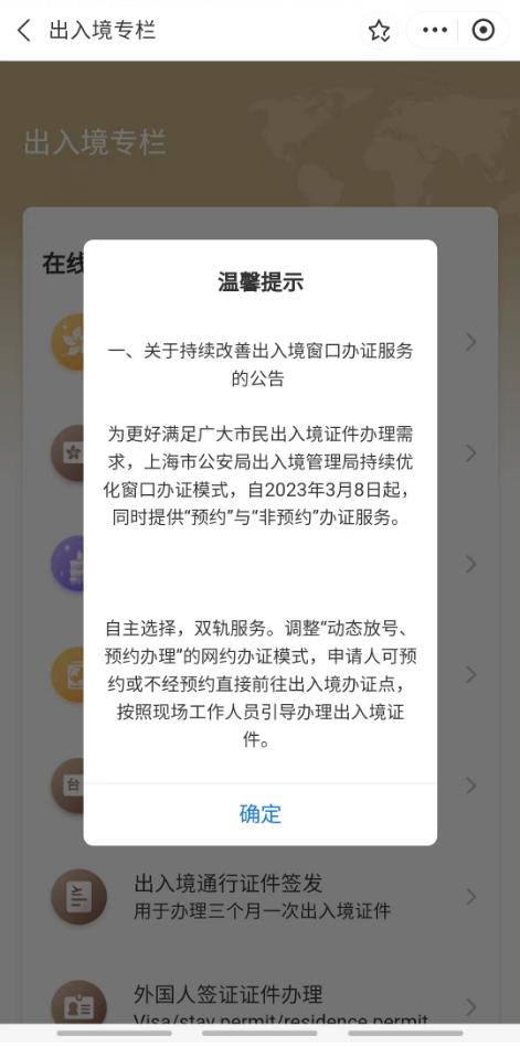 中国公民预约办理出入境证件流程指引1、点击进入“出入境专栏”服务页面后,认真阅读温馨提示并点击“确定”,选择需要办理的事项,点击进入。