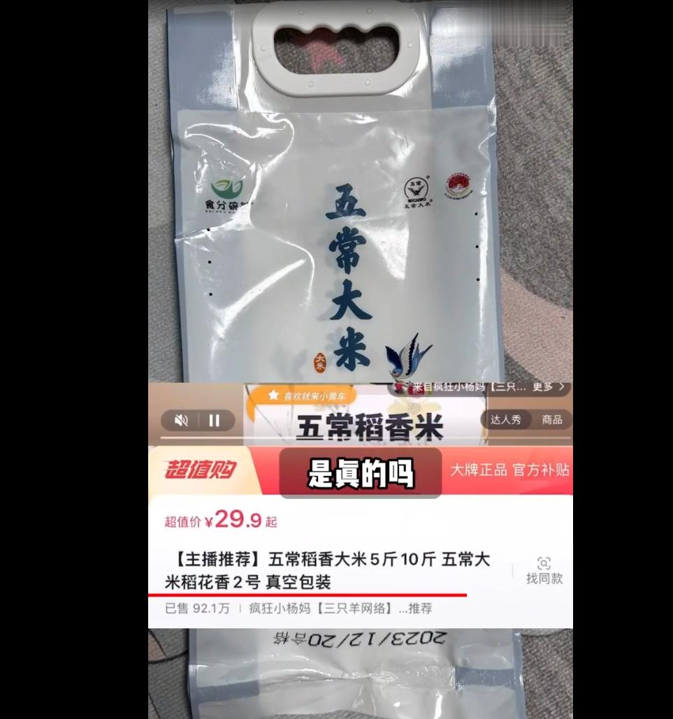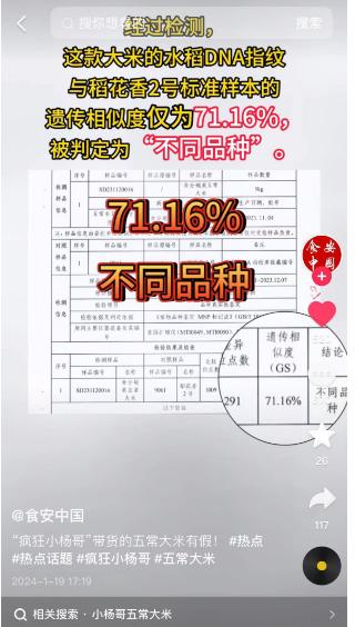 当日傍晚,知名打假人王海发布微博,举报疯狂小杨哥带货90万单假五常大米。王海称:“经过送检,小杨哥的五常大米和稻花香二号对比,遗传相似度只有71.16%,结论为不同品种,实锤以次充好。小杨哥大米包装上标注的GB/T19266,属于食品安全标准,有买到的消费者可要求退一赔十起步价1000元。”值得注意的是,中国食品安全网官方抖音账号“食安中国”也发布了题为“疯狂小杨哥带货的五常大米有假”的视频,视频中称“稻花香2号的综合成本为9块左右,而电商平台显示,小杨哥带货推荐的所谓稻花香2号大米大约6块钱一斤,记者在食分碗美旗舰店购买产品送检后,经检测这款大米的水稻DNA指纹与稻花香2号标准样本的遗传相似度仅为71.16%,被判定为不同品种。”