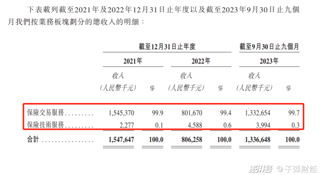 但从招股书披露的数据来看,保险交易服务几乎占据全部收入来源,业务构成极其单一。
