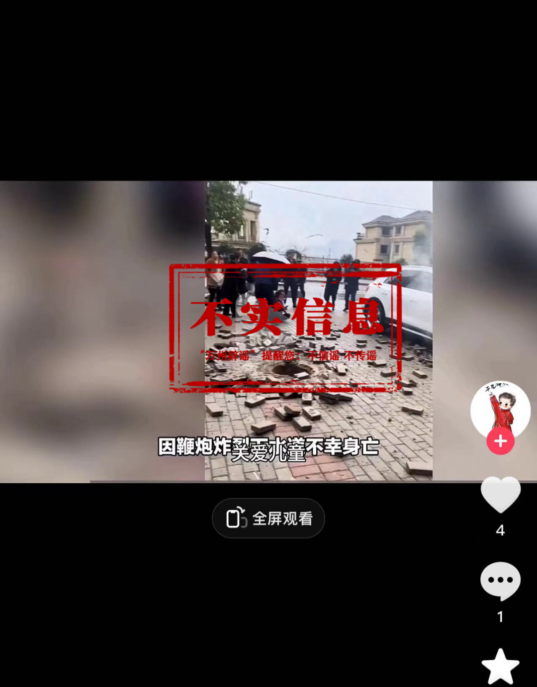“万州辟谣”的消息显示,1月22日,网民@岁月风平 在抖音发视频称,重庆一小女孩将鞭炮扔进下水道,引发爆炸不幸遇难。经核实,该信息不实。万州区委网信办核实了解到,1月21日下午,万州区陈家坝街道南滨上院小区。一小男孩与两名玩伴在小区门前空地玩耍时,将点燃的鞭炮丢入地面一下水道内,引燃沼气掀翻井盖。造成小男孩受伤及旁边停放的一辆白色小轿车受损。目前,小男孩已送医治疗,无生命危险。另外两名小孩轻微擦伤。