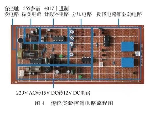 传统的实验过程采用时钟定时触发或音控触发的方式,学生焊接控制电路板,实现对激光图案的定时变换或音控变换,图 4 为控制电路流程示意图。