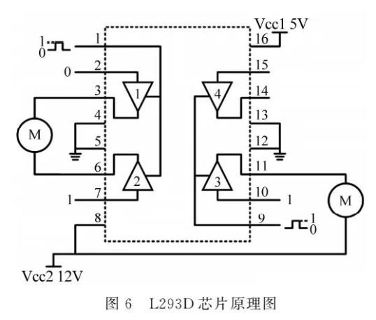 由于 Arduino 单片机的输出电压最高为 5V,不足以驱动 12V 直流电机,本文结合 L293D 芯片实现直流电机驱动电路。图 6 为 L293D 芯片的原理图。16 号引脚连接 5V 电源,为芯片的调控电路提供工作电压;8 号引脚连接 12V 电源,为芯片的驱动电路提供工作电压。2、7、10、15 号引脚为控制信号输入引脚;3、6、11、14 号引脚为驱动信号输出引脚,用于输出信号以驱动电机工作。1、9 号引脚为使能引脚,当使能引脚置于高电平时,相应的输入输出引脚被激活启用,输出与控制信号同相的驱动电压[10]。
