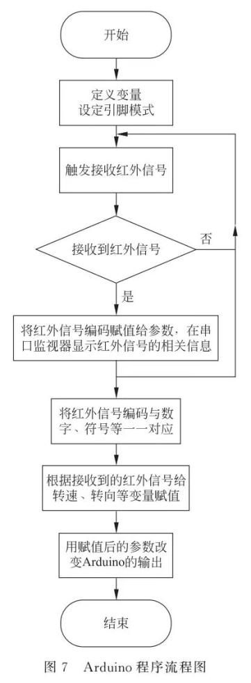 程序开始时,定义引脚、转速、转向等变量,设定引脚的模式。使用 enableIRIn()函数触发红外信号接收模块接收信号,通过 decode()函数判断是否成功接收到红外信号,若接收到红外信号,则将接收到的红外信号解调、编码为六位十六进制编码并赋值给变量 results,并在 Arduino IDE 的串口监视器中显示红外信号的编码和编码位数;若未接收到信号,则各变量保持不变,Arduino 输出信号不变。接收到红外信号后,使用 if-else 语句将红外信号编码与数字 0~9、符号 +、- 对应,并赋值到变量 Input。根据变量 Input 的值的不同,改变转速 speed、转向 Direction 等变量。