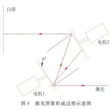 实验装置中,电机上的偏心反射镜所在平面的法线方向与电机转轴不平行,而是存在一个 3°的夹角。图 8 中电机的两个反射镜面位置为电机转动下反射镜面的两个极端位置,成一个 6°的夹角。点状激光直接照射在直流电机上的偏心反射镜上,由于反射镜所在平面的法线方向与电机转轴方向存在夹角,故当电机转动时,反射的点状激光不是固定的一个方向,而是成一个圆锥面,在白屏上呈现为一个圆形或椭圆。经第一个反射镜反射的激光照射在第二个反射镜上,发生第二次反射,在白屏上呈现的图像为两个圆形轨迹运动的叠加合成[11]。