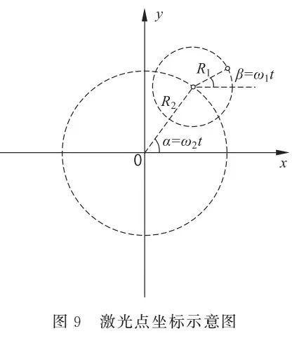 在白屏上建立直角坐标系,如图 9 所示。以水平方向为横坐标、竖直方向为纵坐标,记经过两次反射后,在白屏上显示的激光点的横坐标为 x,纵坐标为 y,则其中,第一次反射形成的圆形轨迹的半径为R1,角速度为 ω1,第二次反射形成的圆形轨迹的半径为 R2,角速度为 ω2。