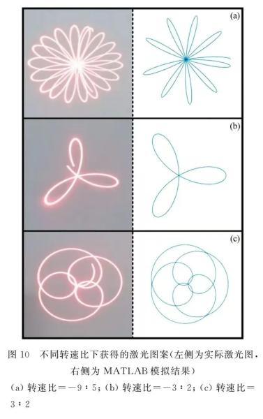 以电压比的正负区分电机转向的改变,分别设定两个直流电机的电压比为 -9∶5,-3∶2,3∶2,在白屏上获得相应的激光图案,如图 11 左侧所示。