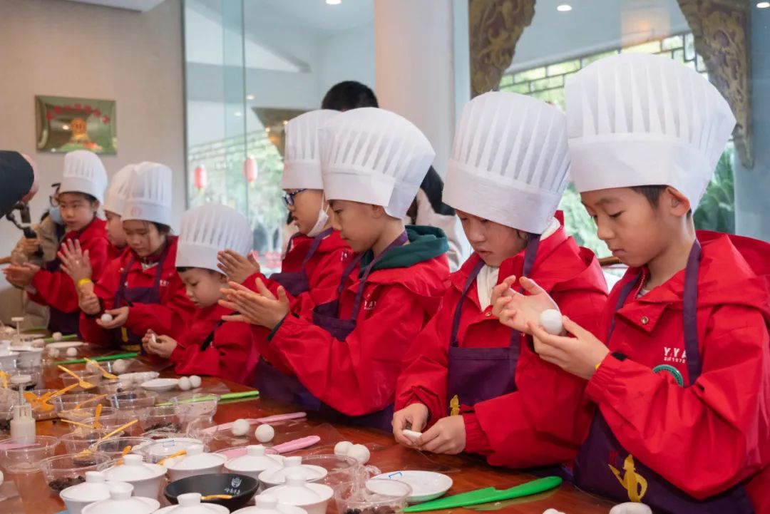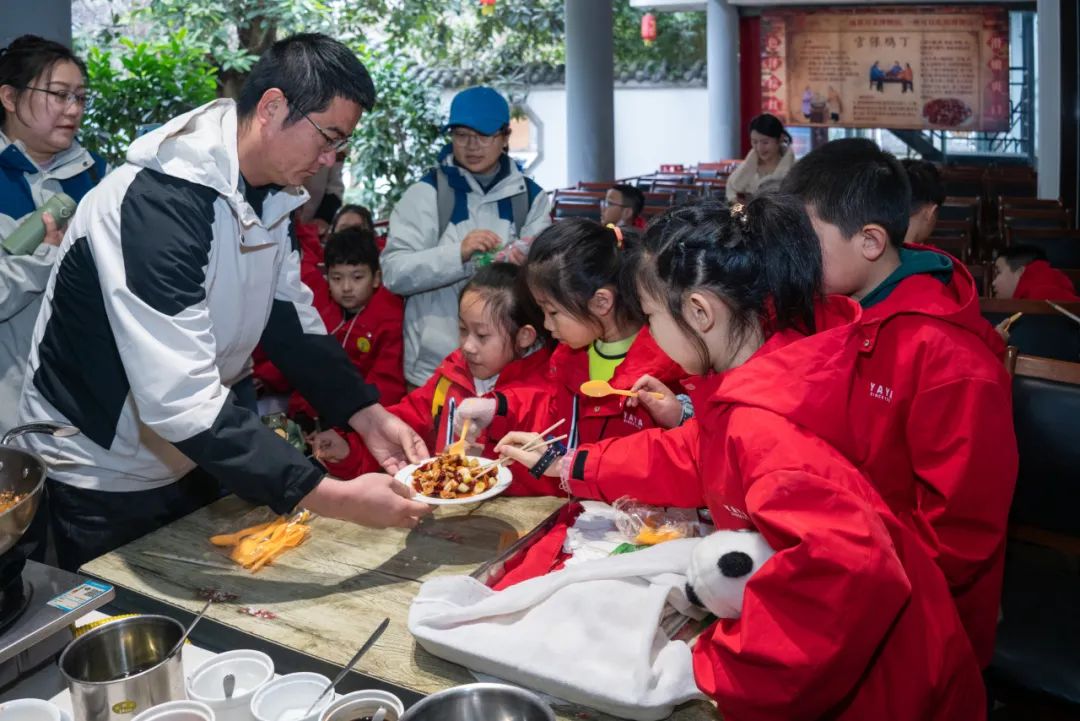 在原料区,“小冻梨”们他们亲身体验了有三百余年历史的郫县豆瓣“翻、晒、露”传统制作工艺,感受“川菜之魂”的独特魅力。厨师现场表演的川菜绝学——蒙眼大刀切金丝面,让他们大开眼界,甚至还动手参与其中,包制了川味十足的熊猫饺子,体验了川菜的刀工之妙。在灶王祠里,“小冻梨”们听着关于灶王的故事,感悟到一餐一饭的来之不易和饮食文化的博大精深。到了最期待的午饭时间,“小冻梨”们前往川菜自助美食区,用舌尖去体会川菜的麻辣、鲜香、醇厚和多变。大家吃得津津有味,纷纷表示这是他们吃过的最美味的饭菜之一。