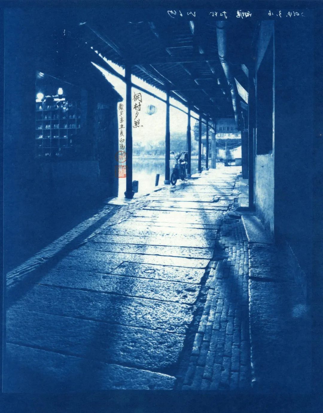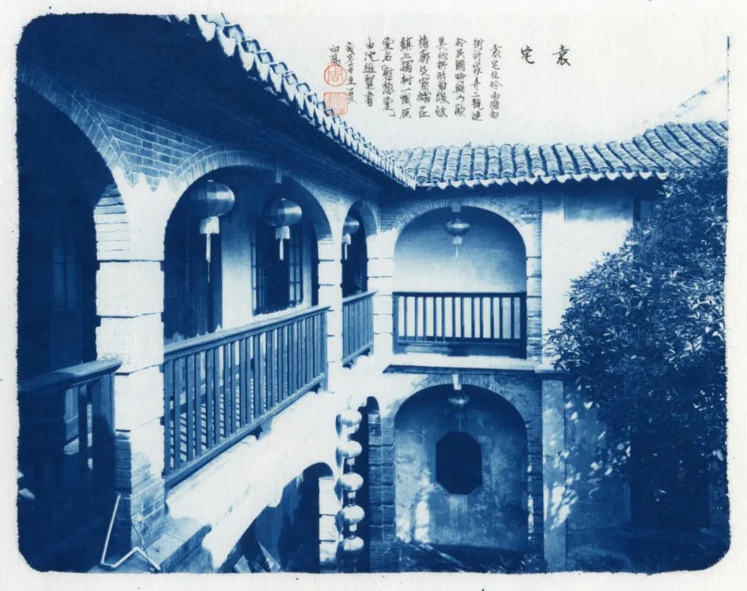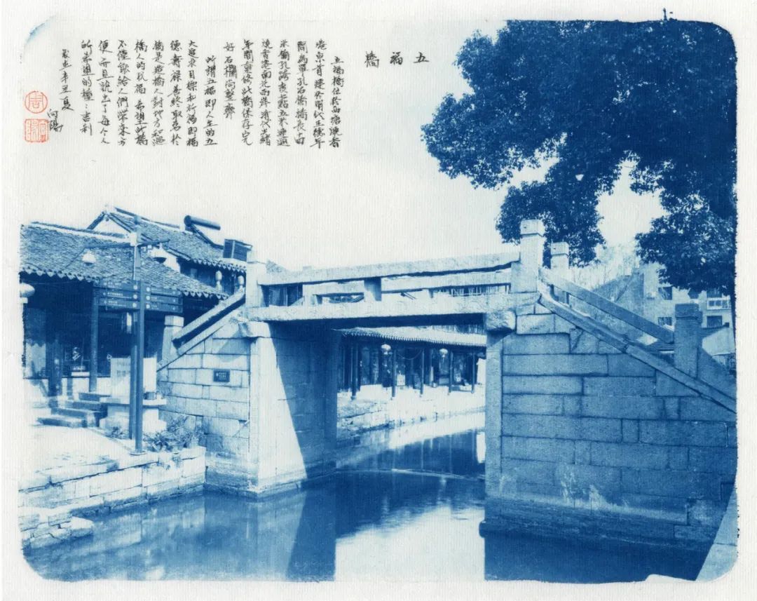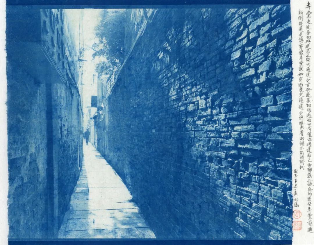 蓝色,又是一种沉着之色,宜于表现一种文化的积淀。它和摄影作品中的古镇相结合,产生了稳定、恬静的文化之美。更有趣的是,他并没有用一般的相纸,而是将作品直接印在具有中国文化特色的宣纸上。为了结合宣纸与书法,向阳用蝇头小楷在上面书写了被摄对象的出典,构成了包含书法、蓝晒、金石钤印组合的,并在宣纸上呈现的中国古镇摄影作品。