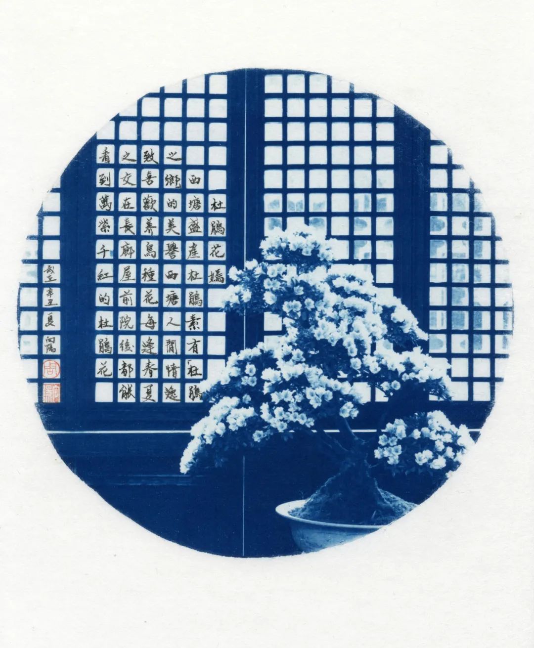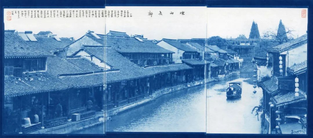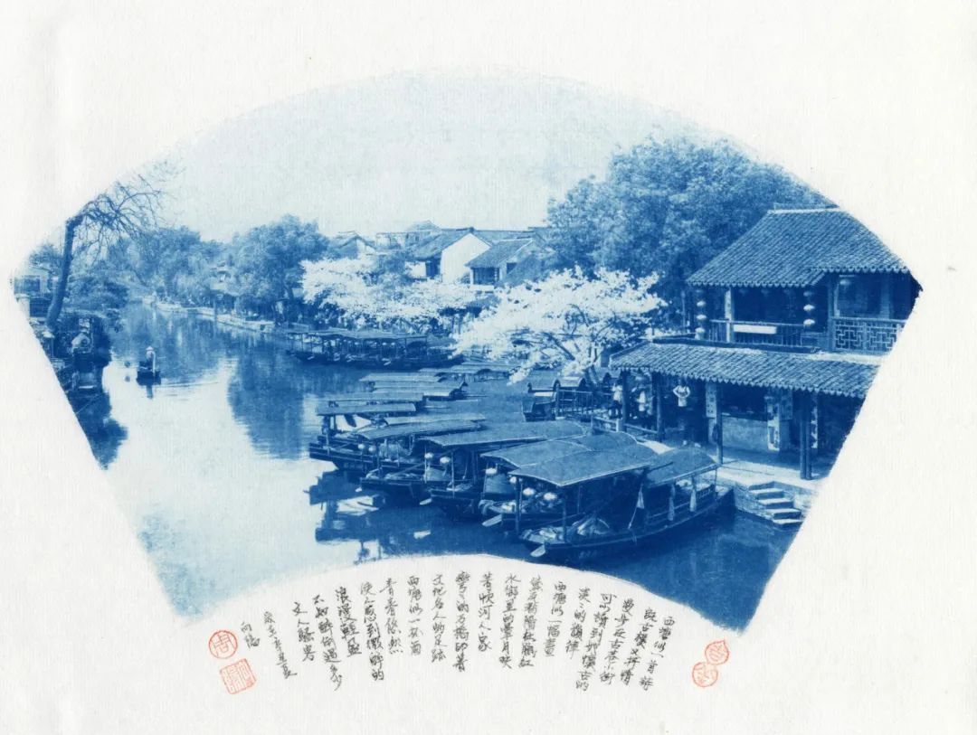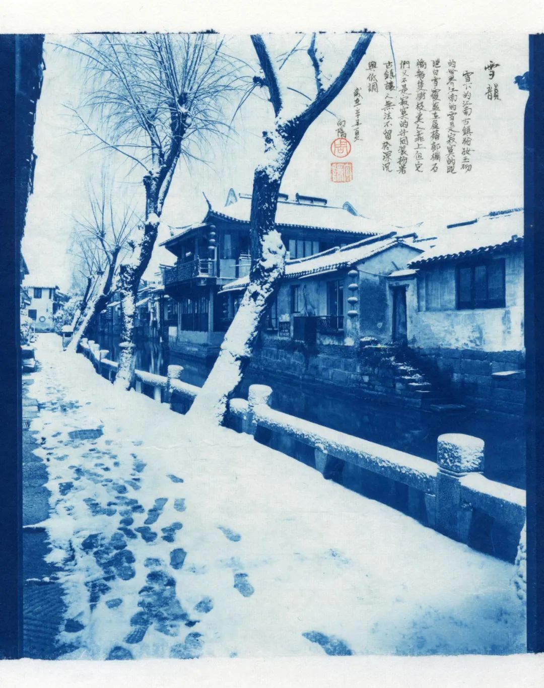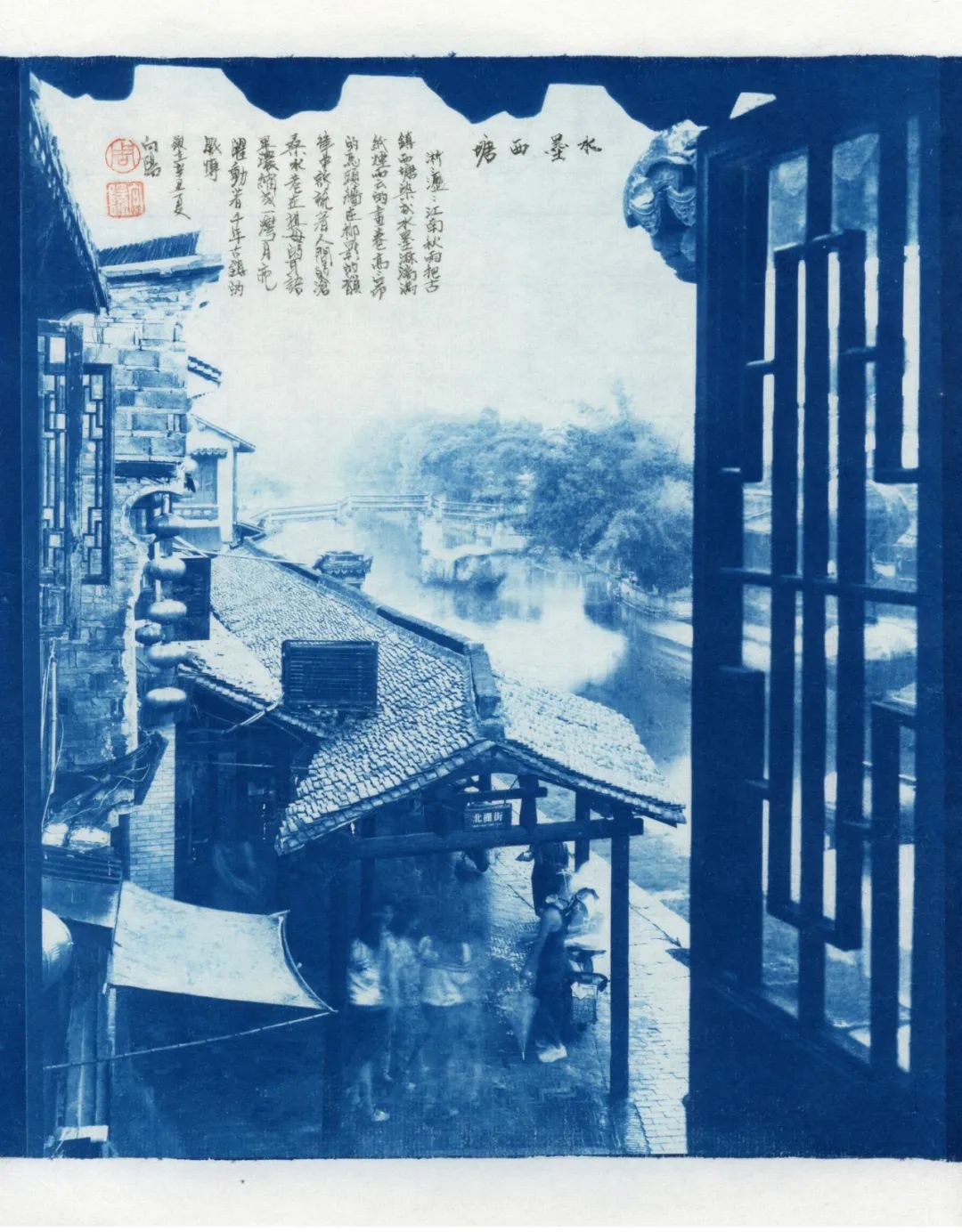 蓝色,又是一种沉着之色,宜于表现一种文化的积淀。它和摄影作品中的古镇相结合,产生了稳定、恬静的文化之美。更有趣的是,他并没有用一般的相纸,而是将作品直接印在具有中国文化特色的宣纸上。为了结合宣纸与书法,向阳用蝇头小楷在上面书写了被摄对象的出典,构成了包含书法、蓝晒、金石钤印组合的,并在宣纸上呈现的中国古镇摄影作品。