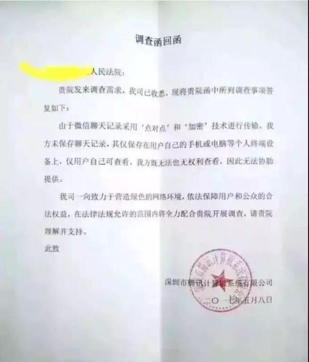 腾讯公司曾公开发布声明,微信不留存任何用户的聊天记录,聊天内容只存储在用户的手机、电脑等终端设备。
