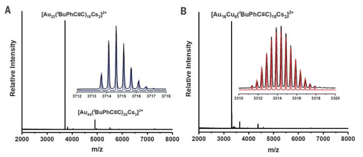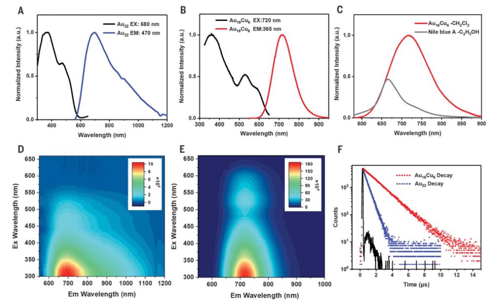 近日,清华大学王泉明教授联合中国科学技术大学周蒙教授报道了报道了一种合金金属纳米团簇 Au16Cu6(tBuPhC≡C)18(Au16Cu6)(其中tBu是叔丁基,Ph是苯基),它与Au22(tBuPhC≡C)18(Au22)构造相同,并在室温(RT)下的溶液中NIR区域显示出接近100%的磷光量子产率。在脱气溶液中Au16Cu6的PLQY大于99%,比Au22高10倍。随后进行了单晶XRD、光物理测量和理论计算,以研究掺杂效应,从而确定几何结构和电子结构与发光性能之间的关系。本研究发现超快系间窜越(ISC)和抑制的非辐射衰变是Au16Cu6独特光物理行为的基础。该论文以题为“Near-unity NIR phosphorescent quantum yield from a room-temperature solvated metal nanocluster”发表在知名期刊Science上。