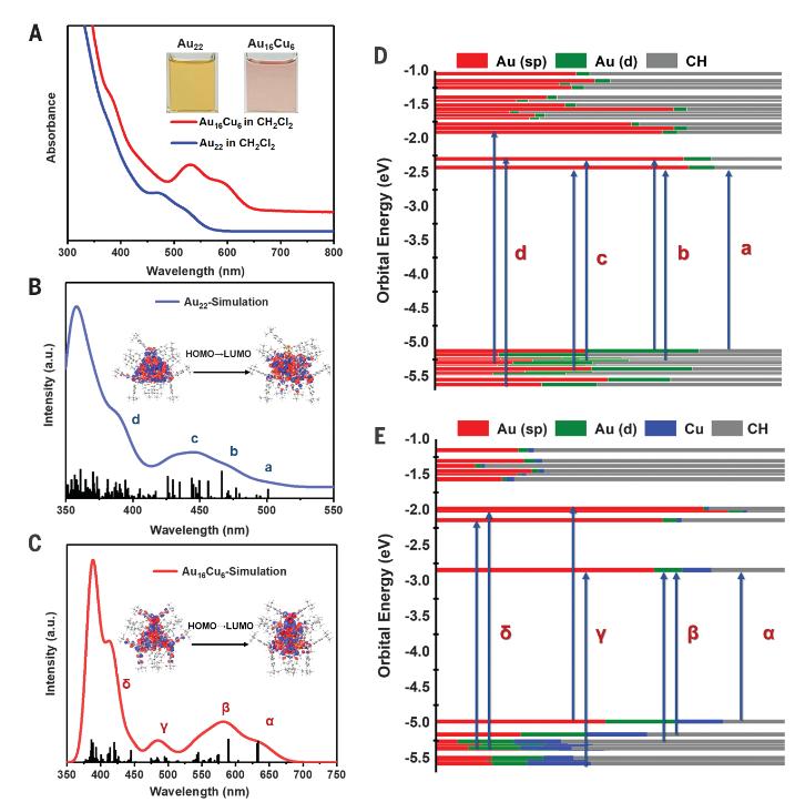 图3 Au22和Au16Cu6的吸收光谱以及TD-DFT计算
