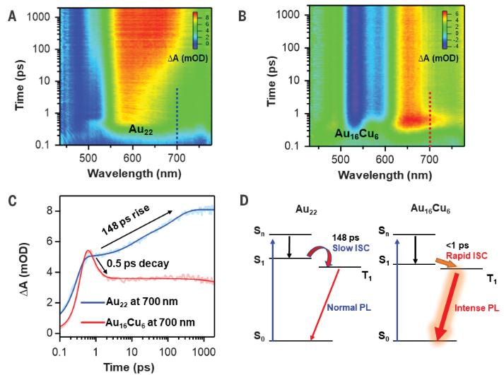 图5 Au22和Au16Cu6在的超快激发态动力学研究由于前沿轨道中 sp 和 d 带的参与,金 纳米团簇已显示出较高的NIR发光性能。研究人员通过在金 NC 中掺杂铜,实现了接近100%的磷光量子产率。激发态动力学研究显示,掺杂导致从 S1 到 T1 的 ISC 速率增加了 300 倍,这使得近100%的磷光量子产率成为可能。这项研究表明,即使在 RT 状态下的溶液中,金铜 NC 合金也能实现近100%的 PLQY,这将使从生物成像到发光器件等各种应用成为可能。未来,作者将对其他掺杂金属的掺杂效果进行研究,这可能会带来意想不到的光学特性。由于配体外壳和金属内核结构可以通过各种合成策略进行改变,因此系统地调节金属 NC 的发射能区也是很有必要的。