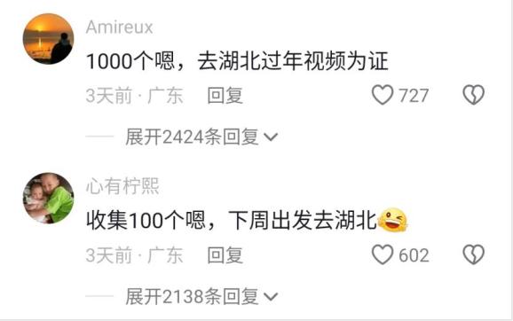 湖北文旅抖音号评论区里可以轻松收取“嗯”声一片