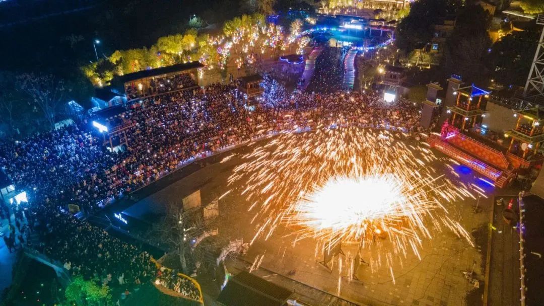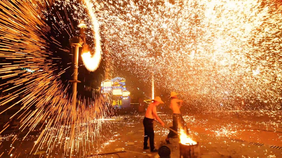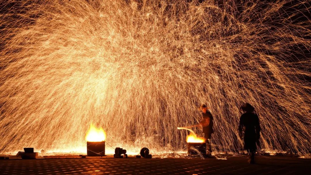 图/木兰不夜城非遗大戏,民间最浪漫的表演艺术——打铁花也在木兰不夜城震撼登场。1600°的高温铁水在传统匠人的演绎下,带来民间最古老的烟火秀。
