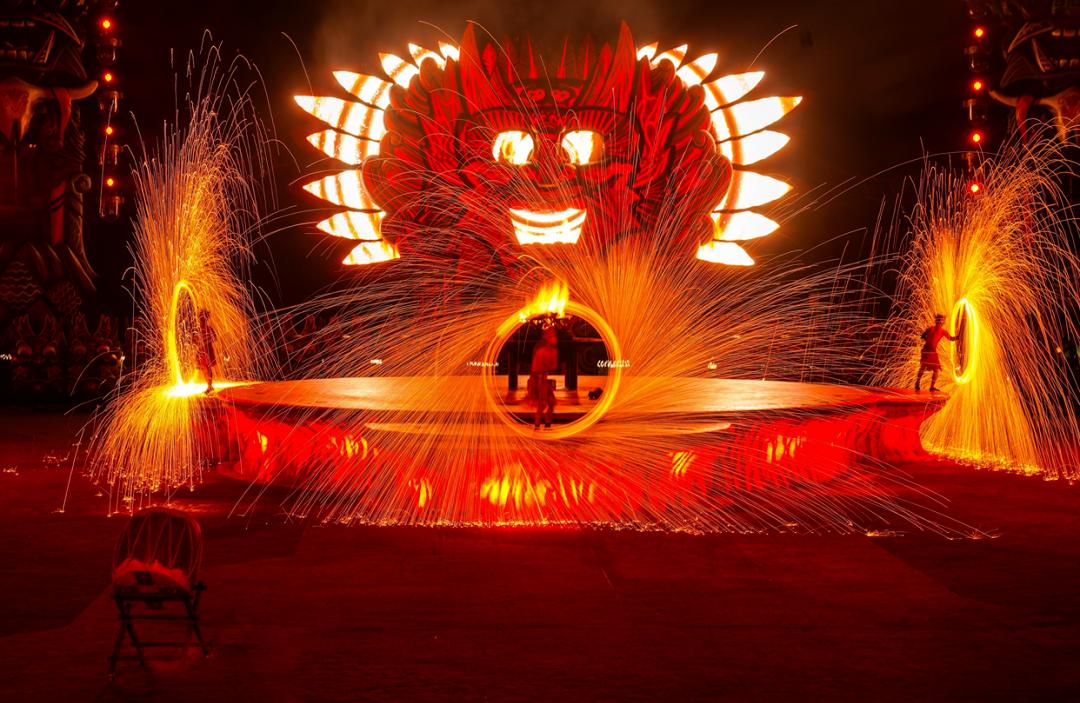 图/木兰草原夜色中篝火燃起,祭祀舞蹈、喷火、打铁花轮番上演,结合灯光、水雾、激光、音箱等特效设备,呈现一场视听盛宴。