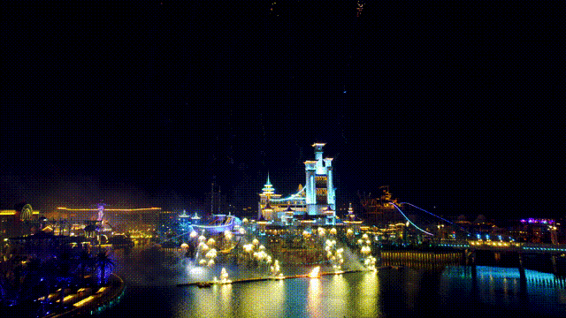 图/襄阳华侨城奇幻度假区夜幕下的奇幻谷,满满奇幻与浪漫。焰火光影落入汉水一路闪耀,星河灿烂,焰火绽放,这里便是人间浪漫的极致。