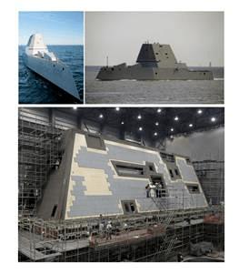 该舰是美国海军的下一代主战舰艇,其集成了当今最尖端的海军舰船技术,舰体造型、电驱动力、指挥控制、情报通信、隐身防护、侦测导航、火力配置等性能均具超越性。特别值得注意的是,该舰上层建筑及内嵌天线系统由美国雷神公司负责设计制造,采用了一体化模块式复合材料结构,质量轻、强度高、耐锈蚀、透波性好,具有极佳的隐身性能,被发现概率低于10%。