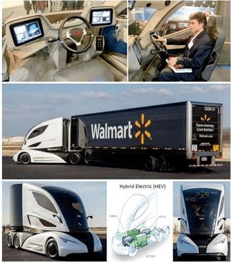 其中,牵引挂车的性能对实现“多拉少跑”的目标关系重大,故沃尔玛公司投入巨资开展“先进车辆体验”的新概念卡车研究计划。已研制的新概念卡车集成了空气动力学、微型涡轮混合动力驱动系统、电气化、先进控制系统,以及CFRP车体等前沿技术。主要技术创新:先进的空气动力学设计,整体造型优雅,气动性能较现行的386型卡车提高20%;微型涡轮混合电力驱动系统清洁、高效、节油;司机座位设计于驾驶室中央,具有180°的视野;电子仪表盘可提供定制化的量程和性能数据 ;滑动型车门和折叠型台阶提高了安全和安保性能;空间宽敞的驾驶室设有带折叠床的可伸缩卧室。牵引挂车的整个车身采用CFRP制成,顶部和侧墙均采用16.2m(53英尺)长的单块板材,其优异的力学性能可确保车体的结构强度;采用先进黏结剂黏合,最大限度地减少了铆钉数量;凸鼻形的造型设计可在充分保证载货容量的前提下,有效提高气动性能;低剖面LED灯光更节能、耐用。