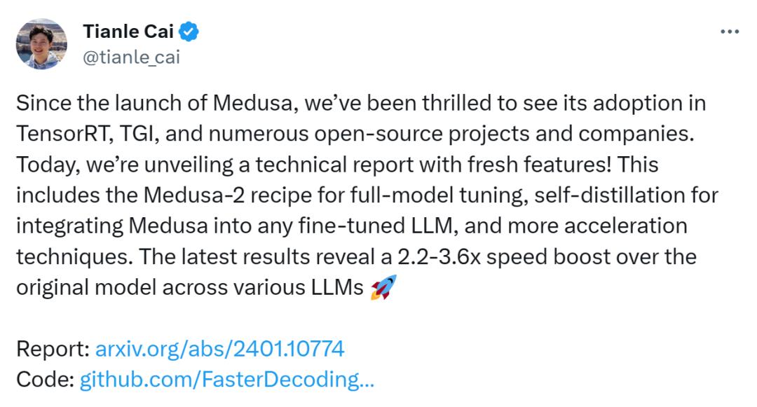 论文共同一作 Tianle Cai 表示,自 Medusa 项目推出以来,它在 TensorRT、TGI 以及众多开源项目和公司中得到采用。在新的技术论文中,我们推出了用于全模型调优的 Medusa-2 方案、用于将 Medusa 集成到任何微调 LLM 的自蒸馏以及其他更多加速技术。