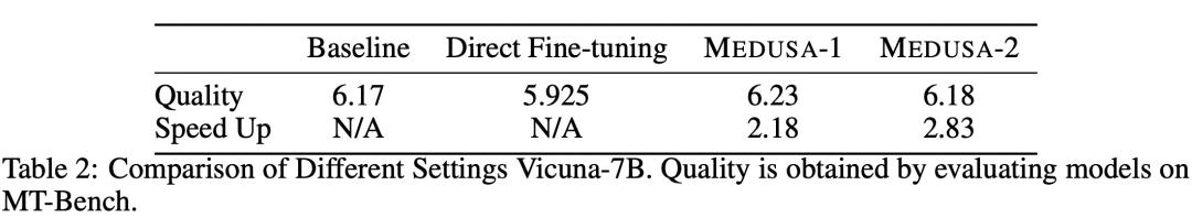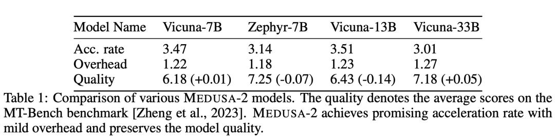 下表 1 展示了不同 MEDUSA-2 模型在 MT-Bench 基准下的加速比、开销和质量。