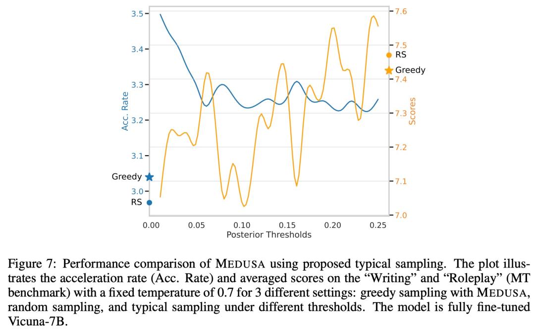 因此,研究者考虑或许可以引入一种典型的可接受方案,即从 MEDUSA 输出中选择合理的候选者。他们使用温度作为阈值来管理原始模型预测的偏差,为拒绝采样提供了一种有效的替代方案。这种方法有效地解决了拒绝采样的局限性,比如在较高温度下速度降低。