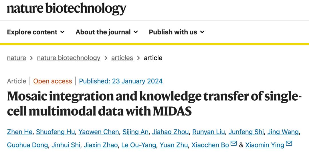 2024年1月23日,军事医学研究院应晓敏团队和伯晓晨团队在 Nature Biotechnology 期刊发表了题为:Mosaic integration and knowledge transfer of single-cell multimodal data with MIDAS(利用MIDAS进行单细胞多模态数据的马赛克整合和知识迁移)的研究论文。