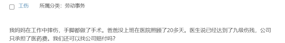 我妈妈在工作中摔伤,手脚都做了手术。爸爸没上班在医院照顾了20多天。医生说已经达到了九级伤残,公司只承担了医药费,我们还可以找公司赔付吗?