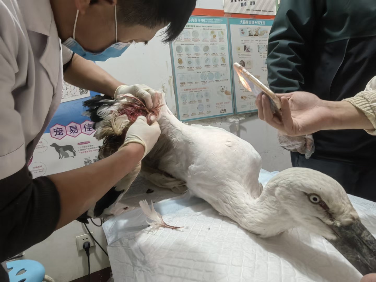 他们发现,每年有三四十只东方白鹳出现这种情况。他怀疑,是部分养殖户“清塘”用的药物有问题,但苦于无法检测,对此事未有结论。
