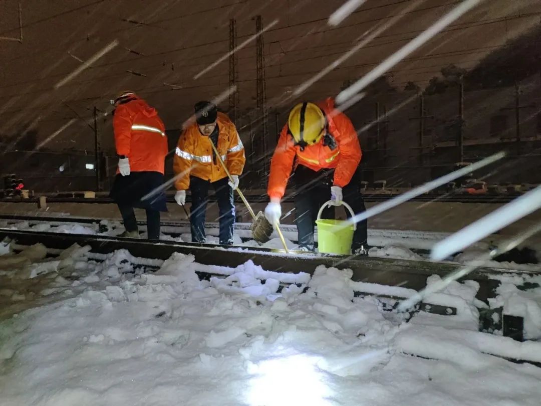 他们每组分别设了一名防护员,盯控、瞭望现场,并使用对讲机联控信号楼,了解列车运行状态,及时通知现场作业人员上、下道,确保人身安全。其他分工的人员分别使用电动喷壶、铁铲、扫帚等工具进行上道作业,对车站的单开道岔、复式交分道岔等关键部位进行除冰扫雪。同时,安排专人对每个道岔涂抹防冻液,确保道岔能有效切换,列车能顺利接进车站。