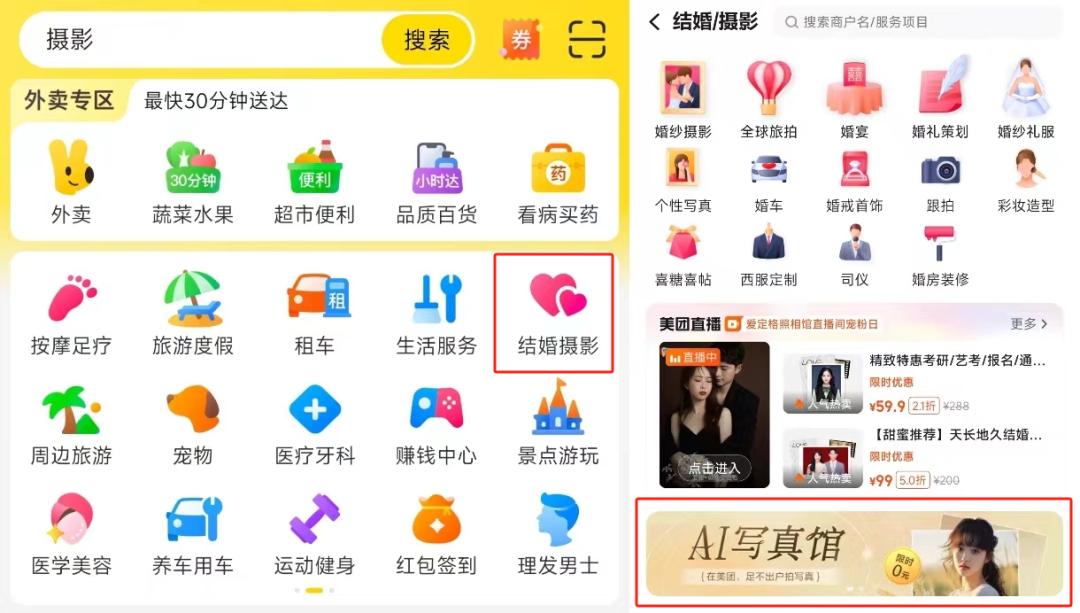 这项功能被放置在APP首页中间应用栏 — 结婚摄影 — 中间广告栏,AI写真馆和婚宴广告被分在了同一个栏位,左右自动切换。