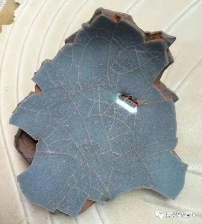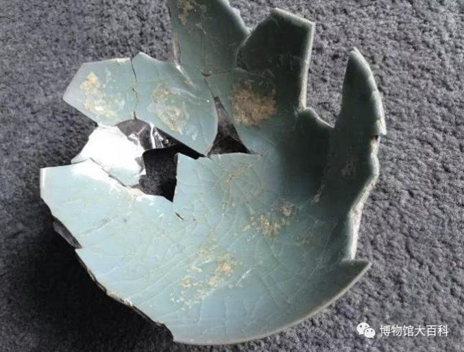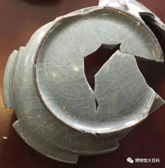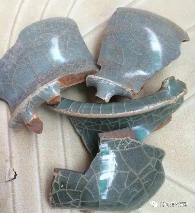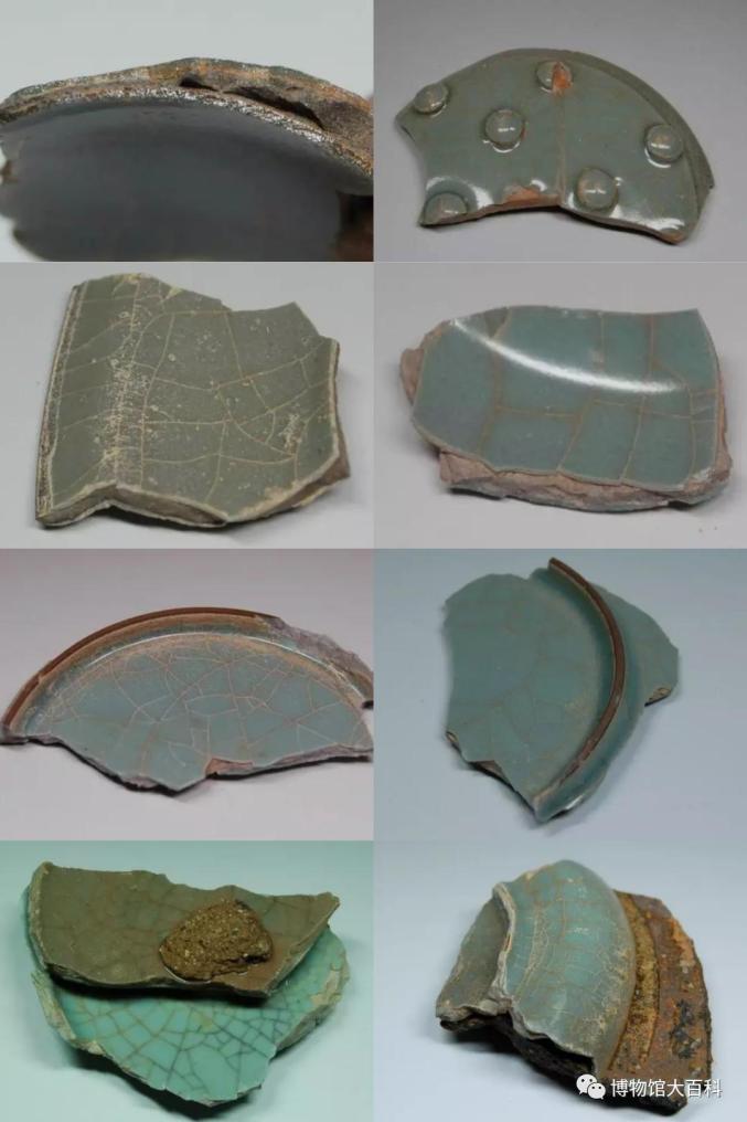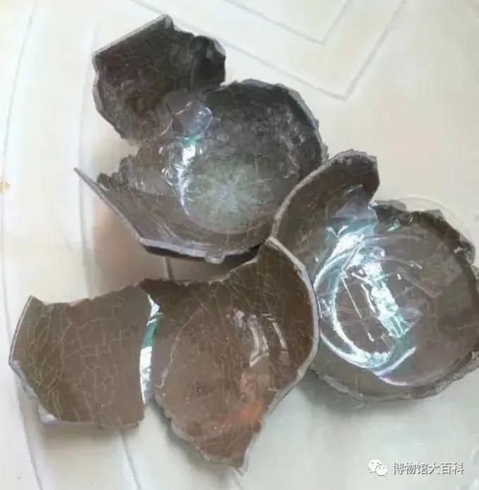 黑胎青瓷的胎则是用瓷石加大量紫金土配制而成,大量紫金土的引入使胎的铝、铁含量大大提高,由此烧造出黑胎青瓷、紫口铁足、露胎以及各种纹片釉新品种。黑胎青瓷胎土质感细腻,断面用十到三十倍的放大镜观看,可以感觉到一种油润感,其色黑灰、深灰或浅灰,皆因其胎土所拌紫金土的比例多少有关。▼黑胎青瓷碎片