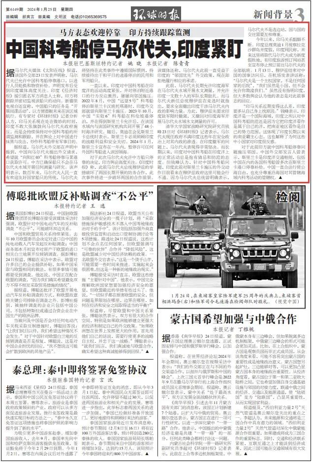 对于此次马尔代夫允许中方船只停靠的决定,印方舆论高度关注。《印度时报》称,此前马尔代夫总统穆伊兹的举措破坏了两国长期开展的防务合作,此次事件将进一步破坏两国的合作前景。该媒体还称,马尔代夫此前一直受益于印度的“邻国优先”外交政策,现在却拒绝履行相应的承诺。