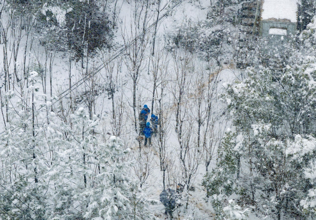 降雪对通信线路造成隐患,电信人徒步前进,对山林中的悬挂光缆开展除冰除雪工作。