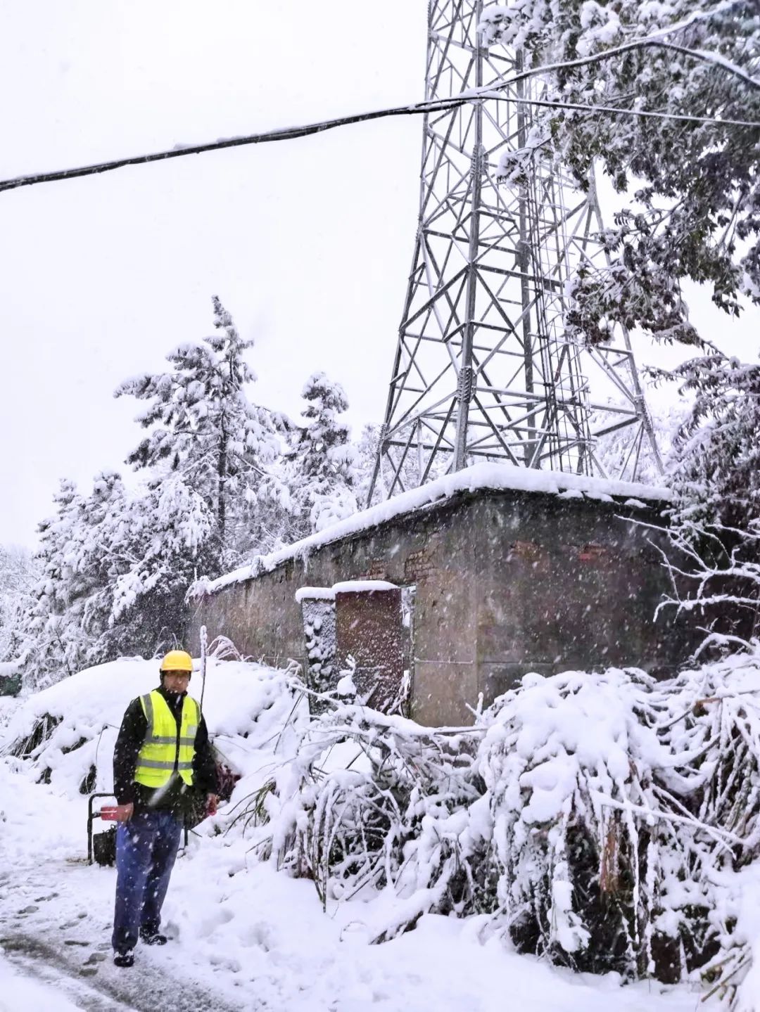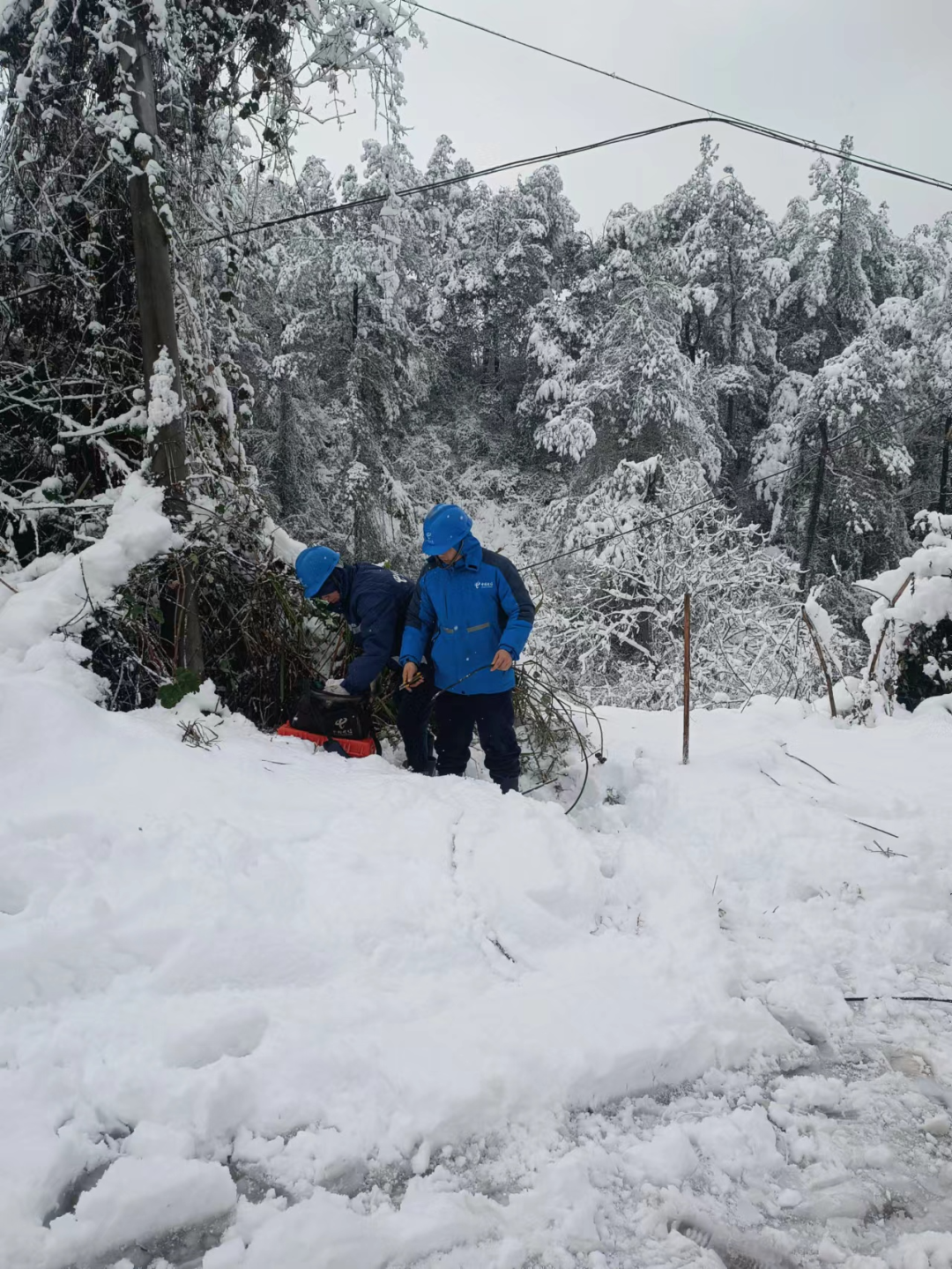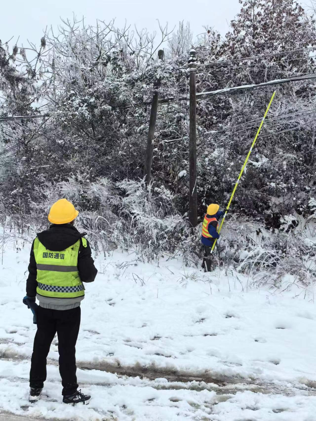 不畏风雪严寒,在一片银装素裹中,电信保障人员开展线路排查。