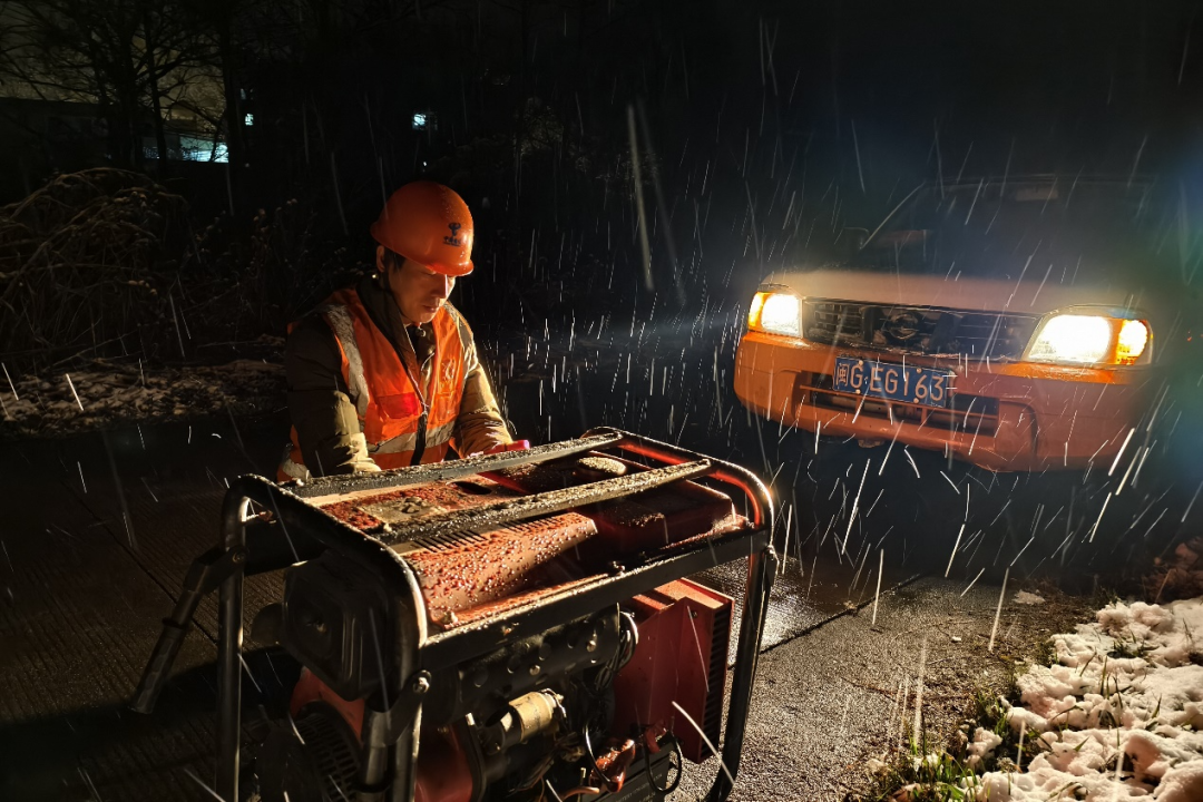 暴雪导致基站市电供应中断,电信保障人员连夜携带发电油机赶赴故障点位开展应急供电,通宵工作保障基站正常运行。